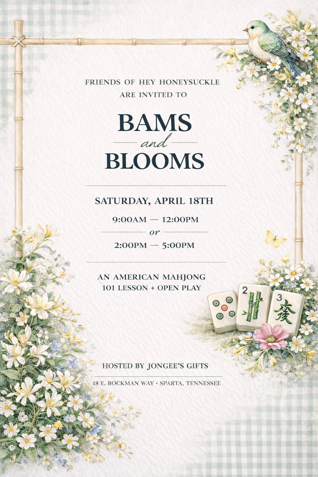 Complete your Garden Party Weekend (hosted by Tracy of Hey Honeysuckle) with a charming and social introduction to American Mahjong inside the beautiful Mahjong Parlour at Jongee’s Boutique in Sparta, Tennessee.